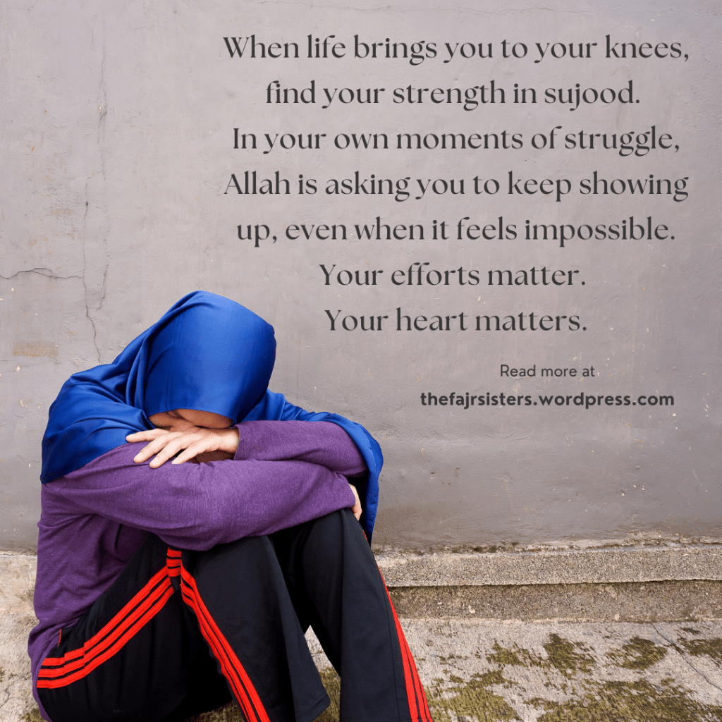 When life brings you to your knees, find your strength in sujood. In your own moments of struggle, Allah is asking you to keep showing up, even when it feels impossible. Your efforts matter. Your heart matters.